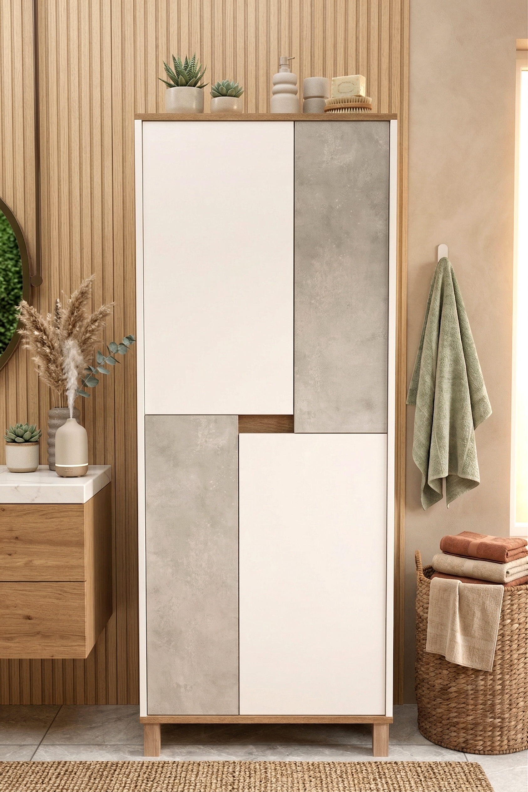 Nord Çok Amaçlı Dolap Mutfak Kiler Erzak Banyo Dolabı 175cm Sepet-Beyaz-Taş ND15-SW Nord Çok Amaçlı Dolap Mutfak Kiler Erzak Banyo Dolabı 175cm Sepet-Beyaz-Taş ND15-SW Ölçü : Genişlik :697 mm Derinlik: 400 mm Yükseklik: 1750 mm Kullanılan Malzemeler : 1.sınıf E1 kalite standartlarında çevre ve çocuk sağlığına uygun melamin kaplı 18mm yonga levha kulanılmıştır. 1.sınıf E1 kalite standartlarında çevre ve çocuk sağlığına uygun melamin kaplı 3mm mdflam kullanılmıştır. 0.80mm pvc bant kullanılmaktadır. 1.sınıf bağlantı elemanları ve aksesuarlar kullanılmaktadır. Kulplar paslanmaz metal hammaddeden imal edilmiştir. 100x44x44mm kare kayın ahşap ayaklar kullanılmaktadır. Bağlantı Sistemi Ürünü oluşturan parçalar minifix bağlantı sistemiyle birleştirilmektedir. Ürün defalarca sökülüp takılma özelliğine sahiptir. Paketleme Sistemi Uluslararası standartlarda dolgu malzemeleri ile paketlenen ürünümüz, sizlere en güvenli ve profesyonel şekilde ulaştırılmaktadır. ... Devamını Gör