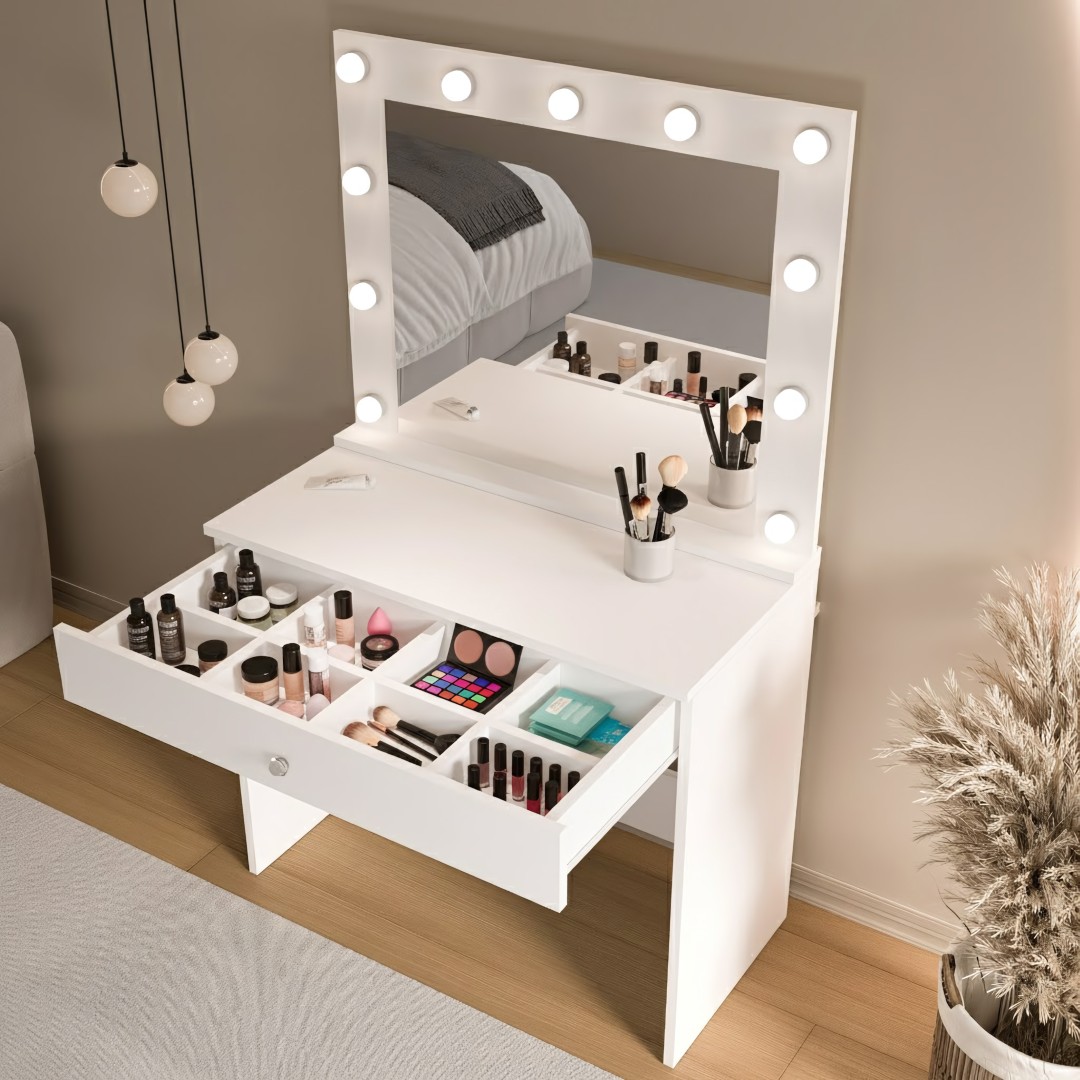 Monroe Makyaj Masası Çekmeceli Düzenleyici Hollywood Led Işıklı Raflı Beyaz MO4-W