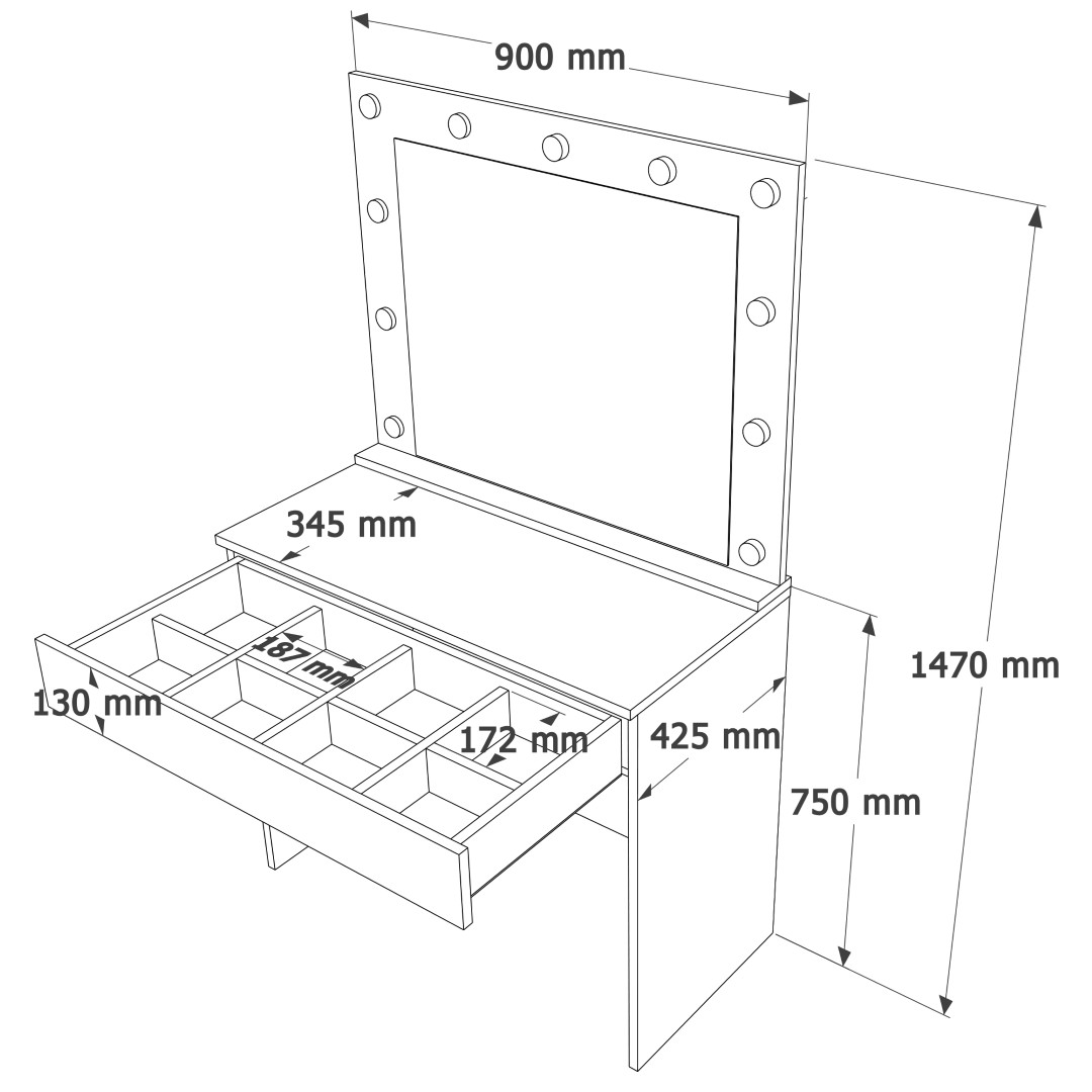 Hollywood ampul seti makyaj ışıkları ürüne dahildir. Ölçü : Genişlik : 900 mm Derinlik: 425 mm Yükseklik: 750 mm + 720 mm Kullanılan Malzemeler : 1.sınıf E1 kalite standartlarında çevre ve çocuk sağlığına uygun melamin kaplı 18mm yonga levha kulanılmıştır. 0.80mm pvc bant kullanılmaktadır. 1.sınıf bağlantı elemanları ve aksesuarlar kullanılmaktadır. Kulplar kristal kesim cam hammaddeden imal edilmiştir. 3mm rodajlı flotal yüksek kalite ayna kullanılmaktadır. Bağlantı Sistemi Ürünü oluşturan parçalar minifix bağlantı sistemiyle birleştirilmektedir. Ürün defalarca sökülüp takılma özelliğine sahiptir.-